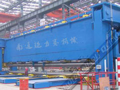船用三輥對(duì)稱式卷板機(jī)結(jié)構(gòu)型式為三輥對(duì)稱式,上輥在兩下輥中央對(duì)稱位置作垂直升降運(yùn)動(dòng),通過液壓缸內(nèi)的液壓油作用于活塞桿而獲得,為液壓傳動(dòng);通過特殊設(shè)計(jì)減速機(jī)分別帶動(dòng)全滾動(dòng)軸承的兩下輥?zhàn)餍D(zhuǎn)運(yùn)動(dòng),為卷制板材提供扭矩;在下輥下部設(shè)有多組托輥,以提高下輥的剛度,并可進(jìn)行垂直調(diào)節(jié);在上輥的上部設(shè)有剛性大梁,在大梁與上輥之間設(shè)有多組托輥,以提高上輥的剛度;適用于超寬圓弧形零件的卷制??删戆搴?mm-50mm,板寬21000mm的板料。
