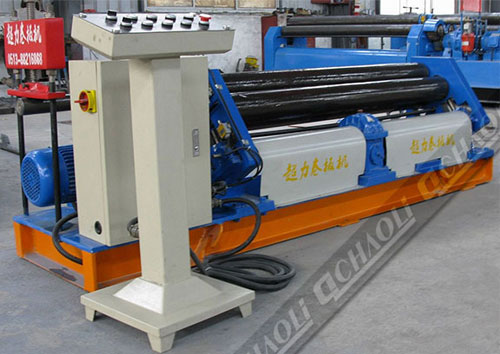 該機結(jié)構(gòu)型式為三輥非對稱式,下輥為主傳動,并做垂直升降運動,以便夾緊板材。通過下輥齒輪與上輥齒輪嚙合,同時作為主傳動,側(cè)輥作傾升降運動。具有預(yù)彎、卷圓多重功能,結(jié)構(gòu)緊湊操作維修方便。